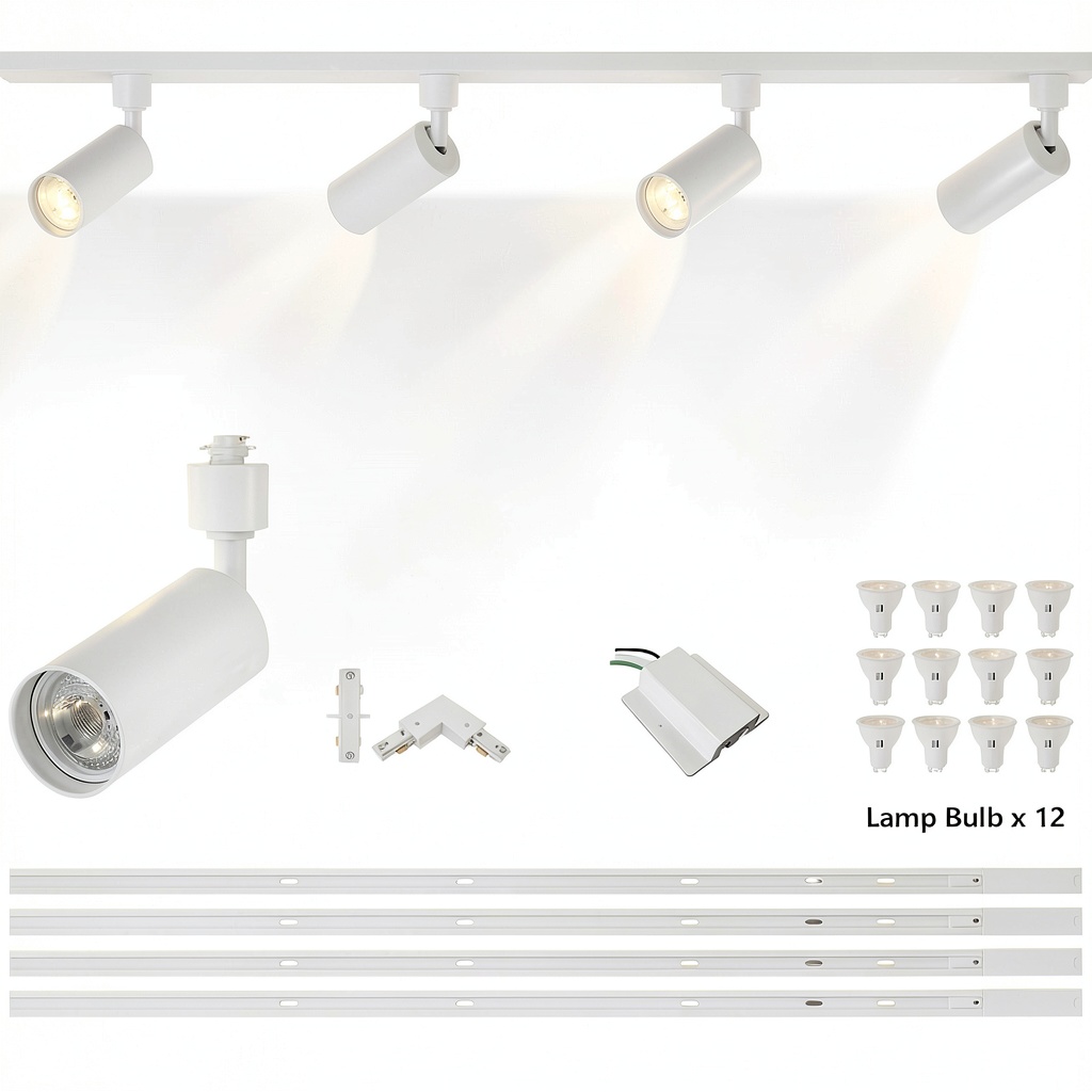 The kit contains 12 GU10 LED bulbs, four 3.28-foot track rails, four connectors, and two floating canopy connectors for complete installation.